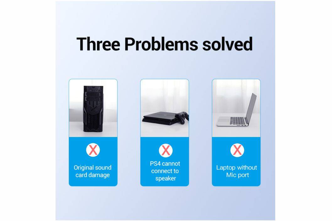 Specifications : 🔹 Length : 0.15 M / 0.5M / 1M 🔹 Connector Interface : USB 2.0 Male to 3 x 3.5mm Female (Mic, Audio, Audio Mic) 🔹 Connector Material : Nickel-plated 🔹 Shell : ABS 🔹 Conductor : Tinned Copper 🔹 Chipset : SSS1629A5 🔹 Shielding : Aluminum Foil 🔹 AWG : 28AWG 🔹 Jacket : PVC
