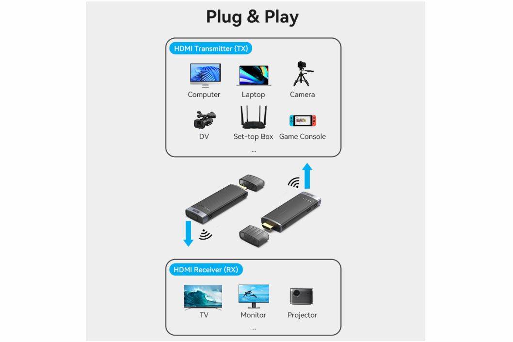Features : 🔹 Full HD Performance 🔹 Long Distance Connection up to 40M with near-zero latency 🔹 Multipoint Connection up to 8 Source Device at same time 🔹 One-Touch Disconnect & Reconnect 🔹 5GHz Band Wi-Fi for smooth and sync audio and video 🔹 USB-C Port for Powered 🔹 Build-In Antenna 🔹 Mirror/Extend Mode